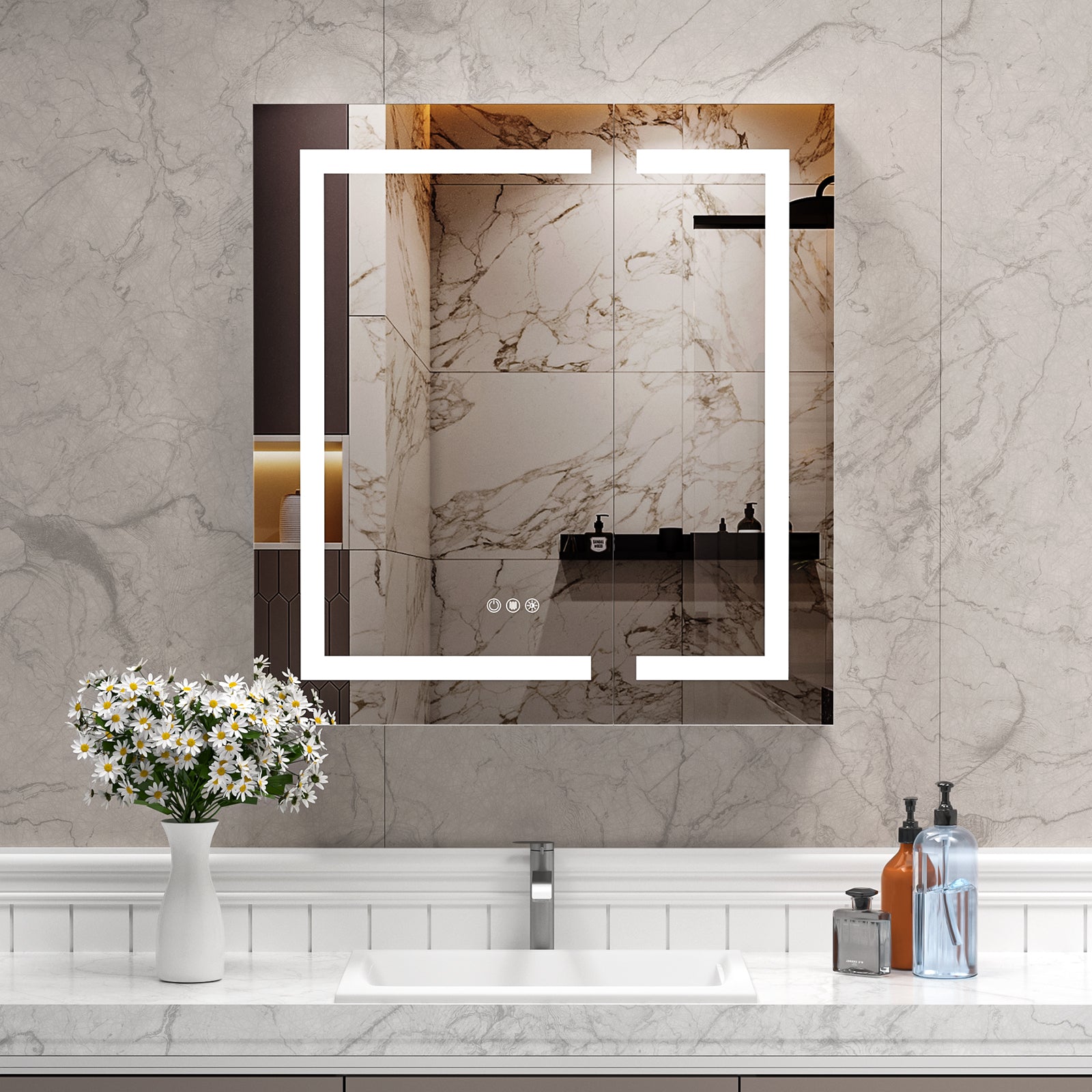 - Anti-Fog: The bathroom medicine cabinet with lights features an anti-fog function and is waterproof. By activating the anti-fog button, it resists condensation and steam, ensuring clear visibility. Keep your bathroom mirror medicine cabinet crystal-clear