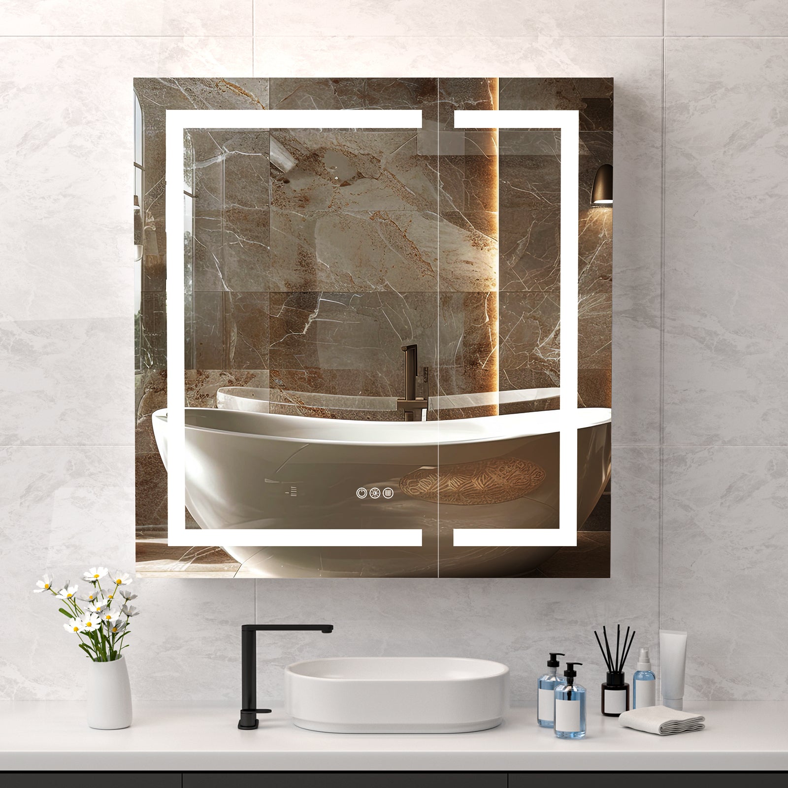 - Anti-Fog: The bathroom medicine cabinet with lights features an anti-fog function and is waterproof. By activating the anti-fog button, it resists condensation and steam, ensuring clear visibility. Keep your bathroom mirror medicine cabinet crystal-clear