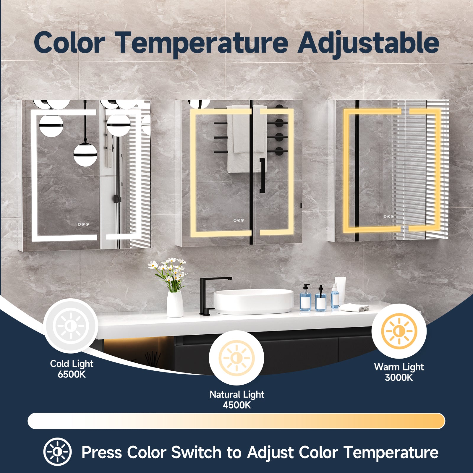 - 3 Color Temperatures: Toggling the medicine cabinet mirror's light settings (warm, neutral, and cool) to suit your preference, perfect for makeup or shaving, easily switch between settings to achieve your ideal lighting for every occasion
