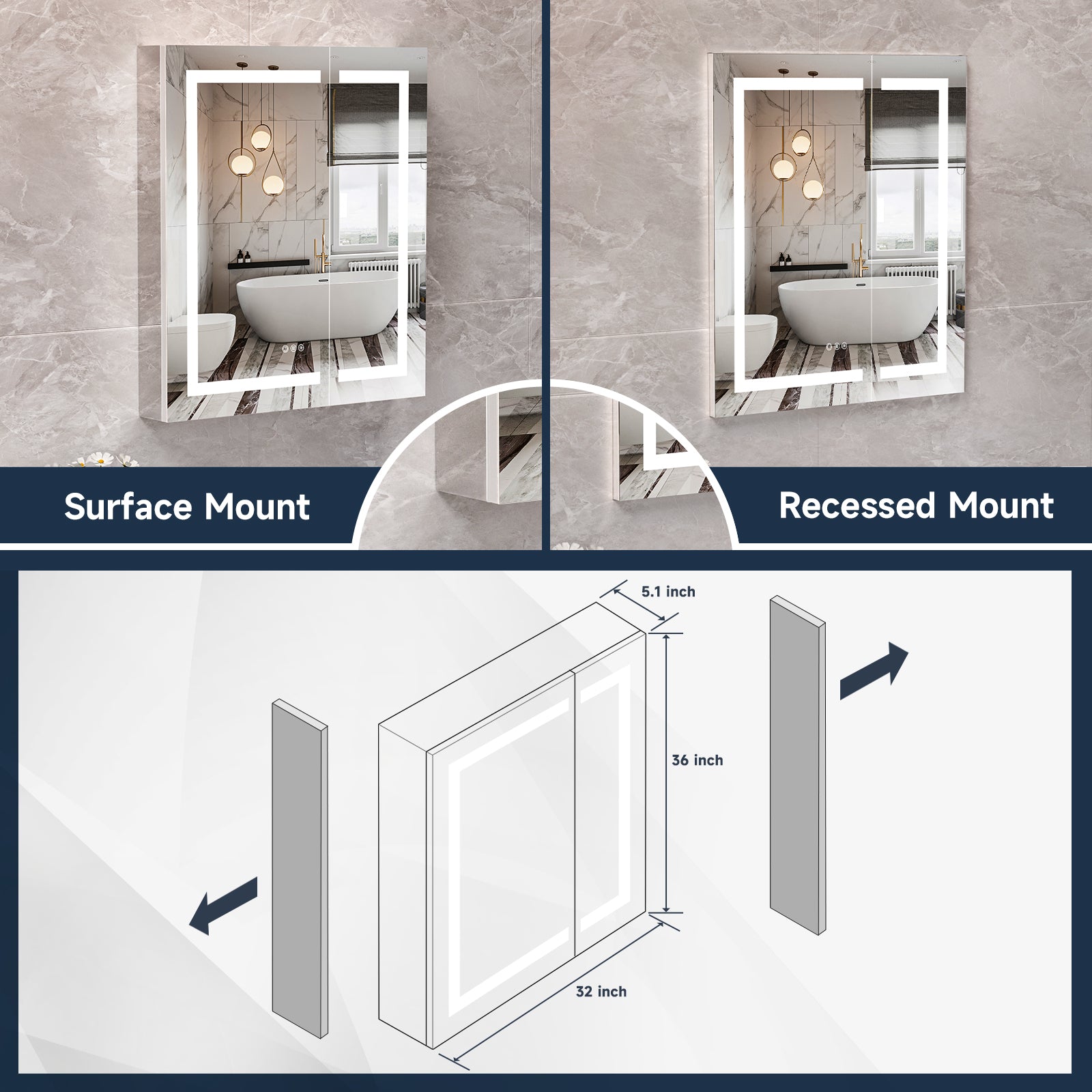 - Dimmable Brightness: Easily adjust the lighting level of your led medicine cabinet with built-in dimming options, ensuring the perfect lighting for your grooming routine, making it smoother and quicker