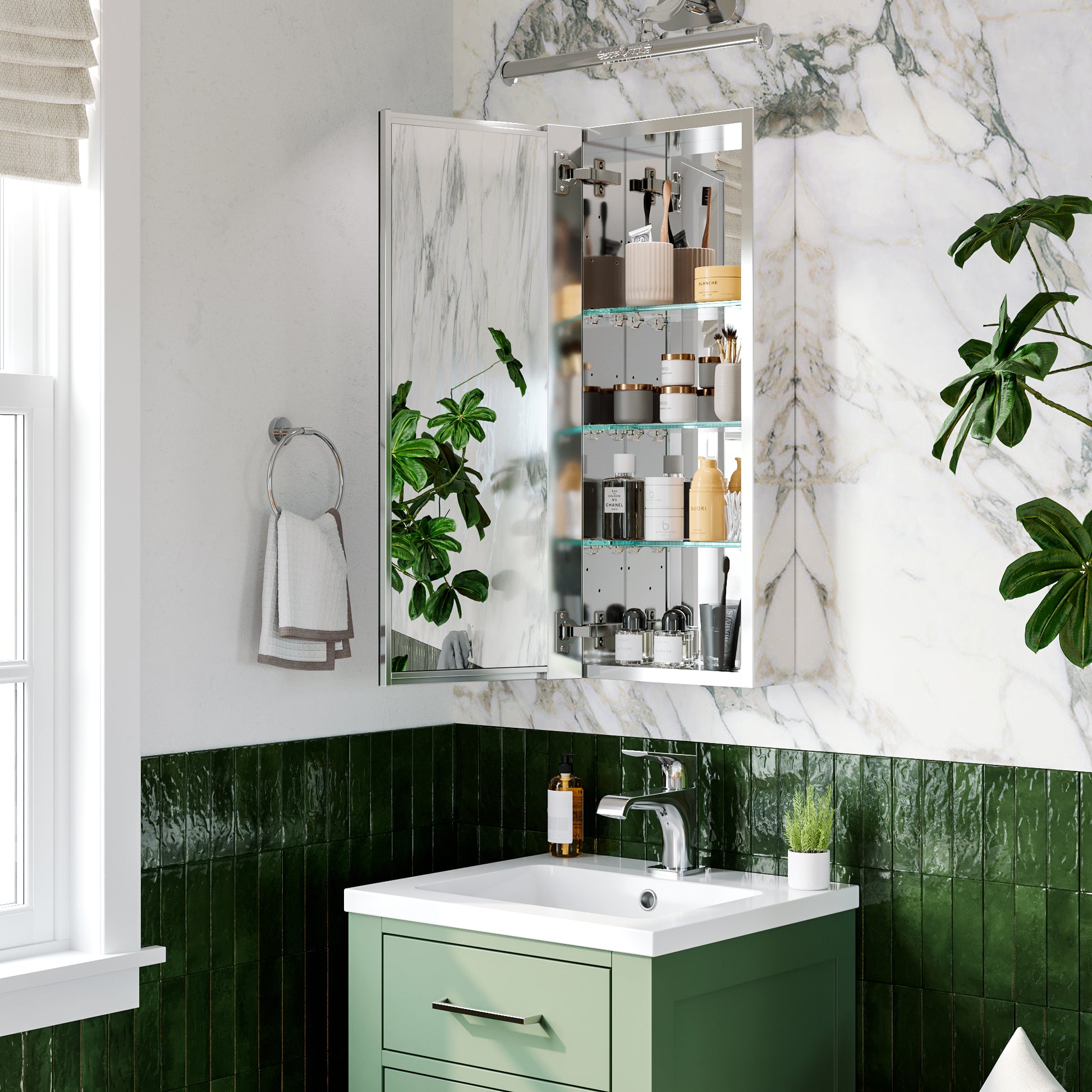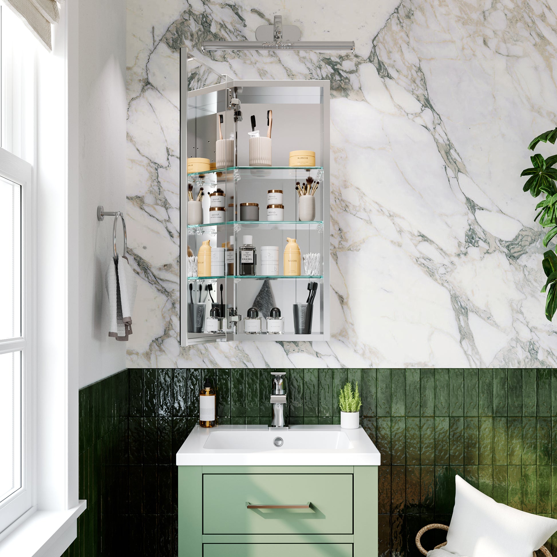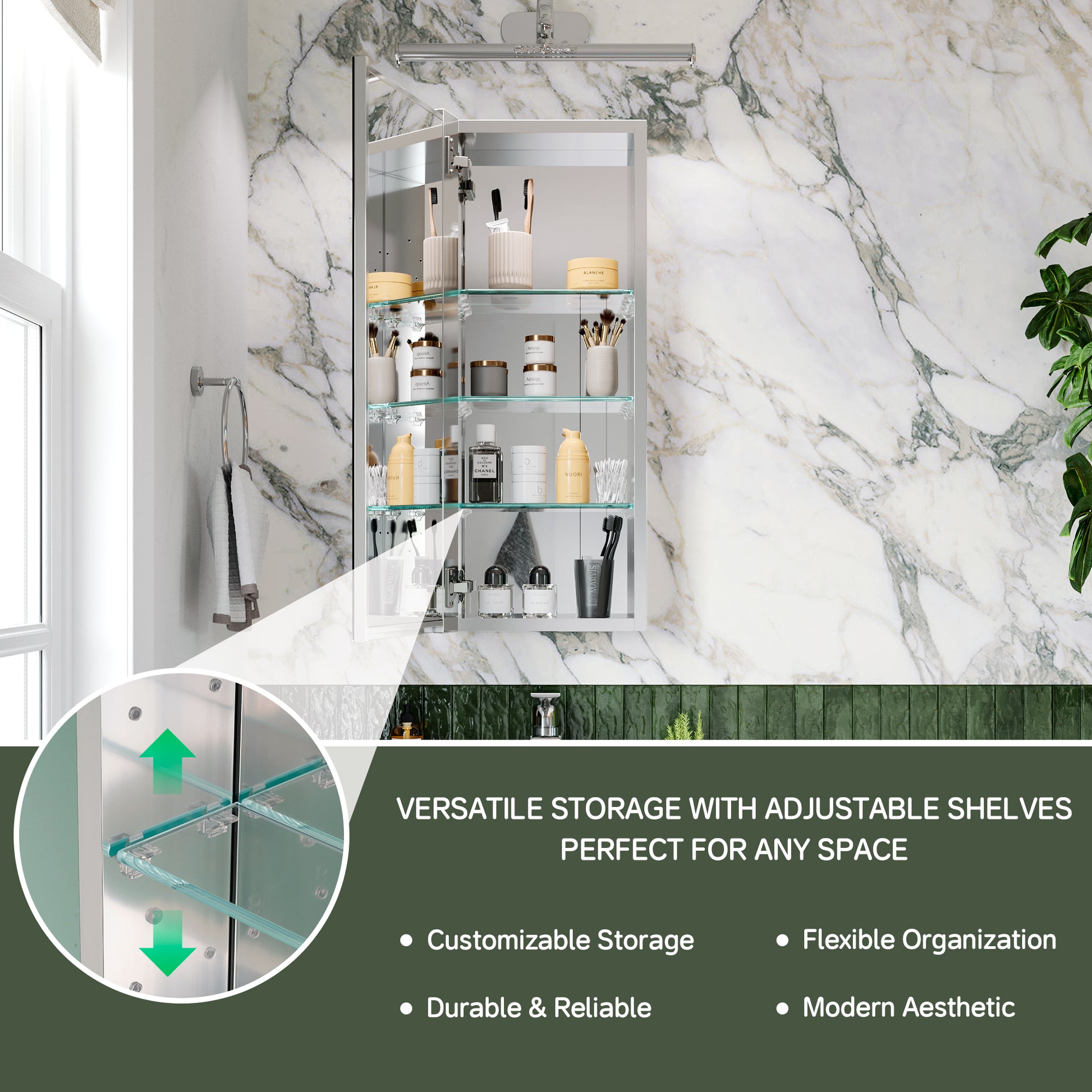 ✅ Anodized Chrome Aluminum Body: Crafted from high-grade anodized aluminum, the cabinet is rust-resistant, lightweight, and built to last. The sleek chrome finish adds a modern and sophisticated touch to your bathroom.